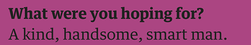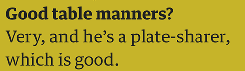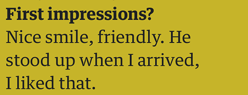 Disclaimer: The comments I make about the couples are meant to be light, playful and merely a LOL to help us escape the joyless tundra of our daily existence. My responses are based only on the answers given by the participants, which the Guardian chooses to publish and usually edits to make them less boring or fit onto the page. Boys, I was rooting for you. I believe in you. Mediate. Get in touch if you want to give us your side of the story; I’m nice.